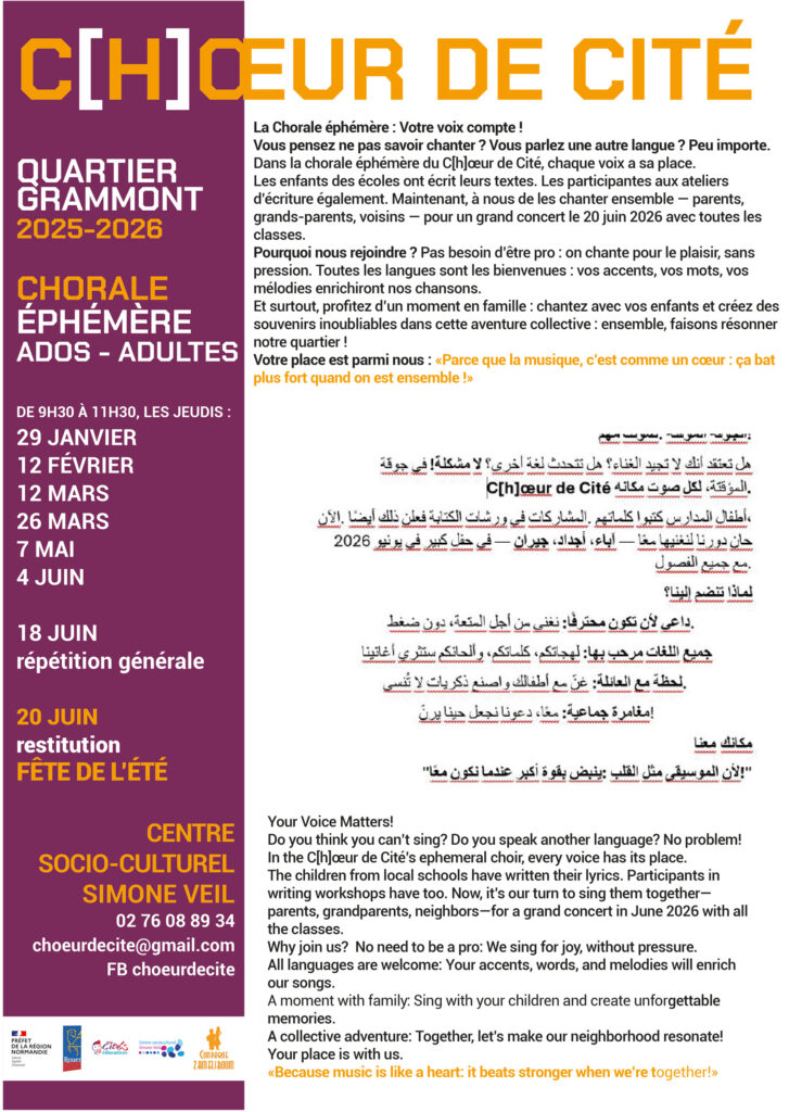 C[h]oeur de cité est un projet à l’initiative du centre André Malraux, et en collaboration avec la ville de Rouen, les associations du quartier des Hauts de Rouen et les élèves et enseignant.e.s des écoles primaires Marot et Rameau (2020-2023).